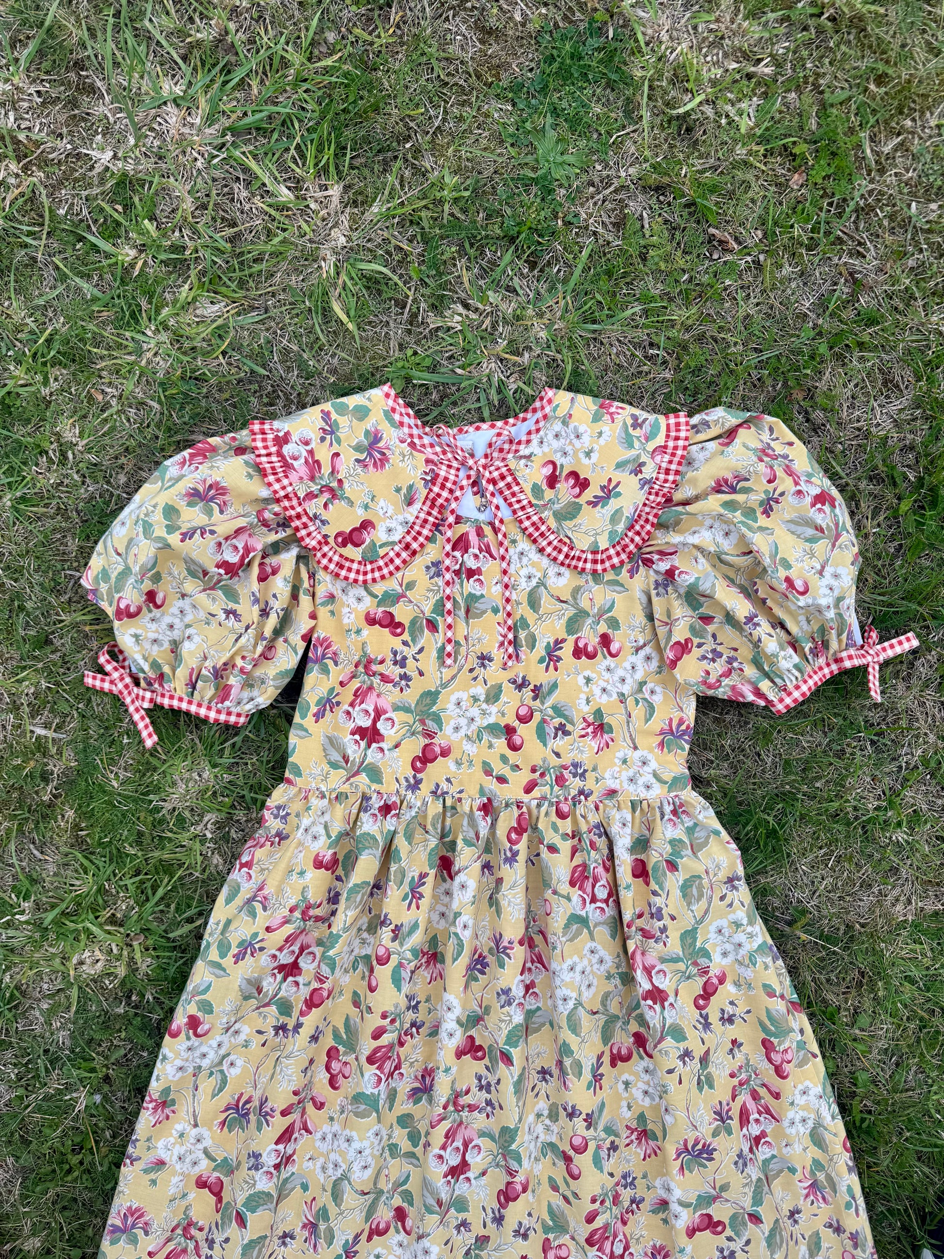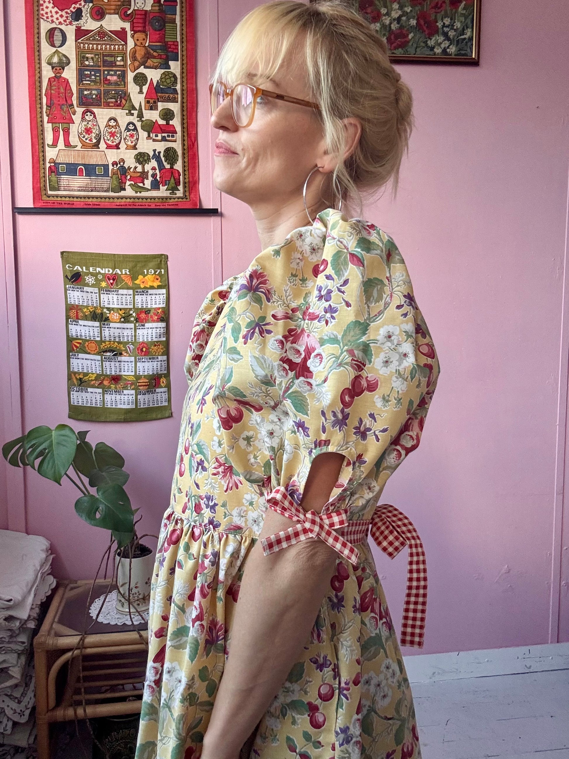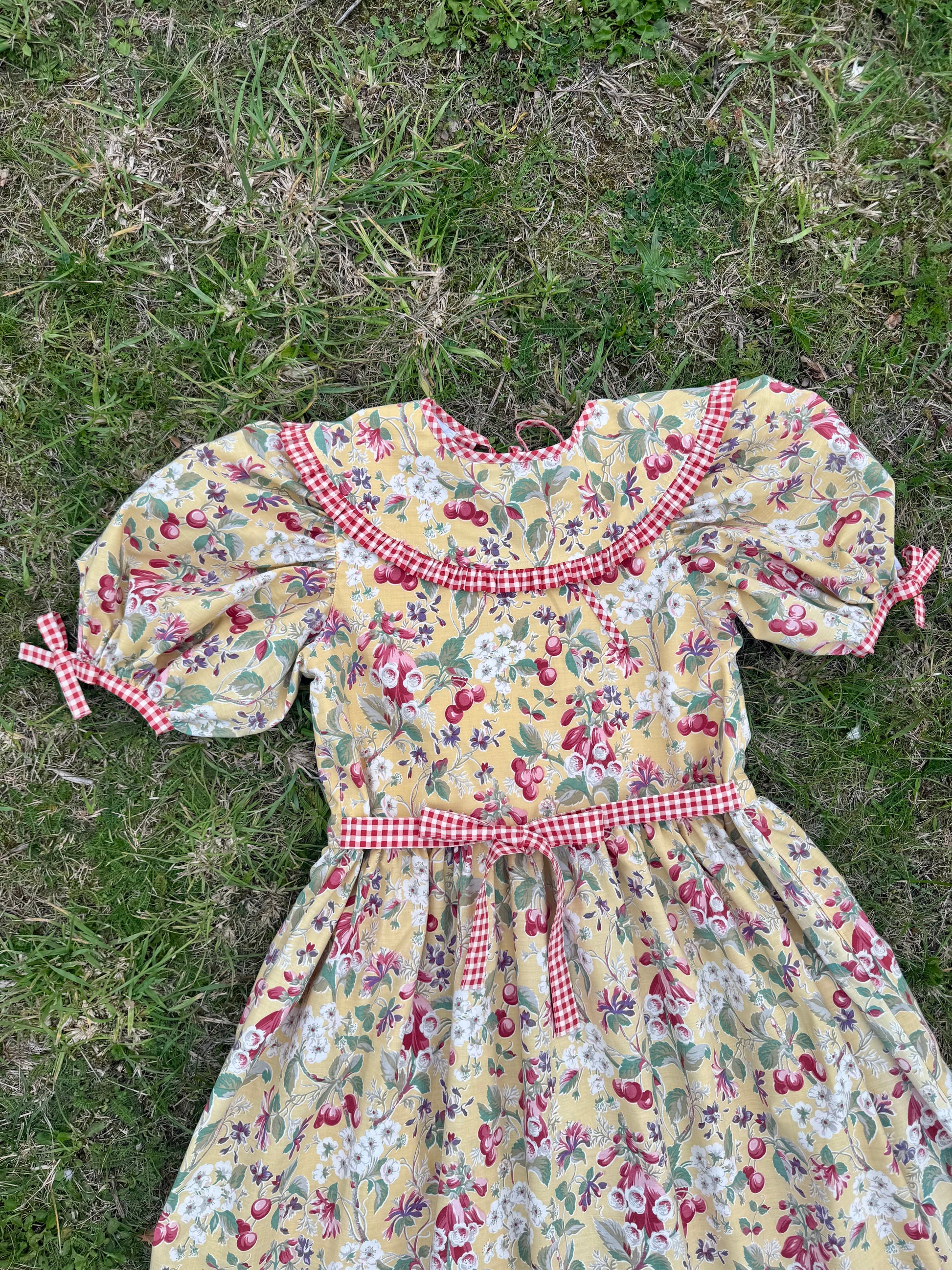 Yellow fruity dress made from vintage curtains with an amazing print-cherry and cherry blossoms and gingham curtains