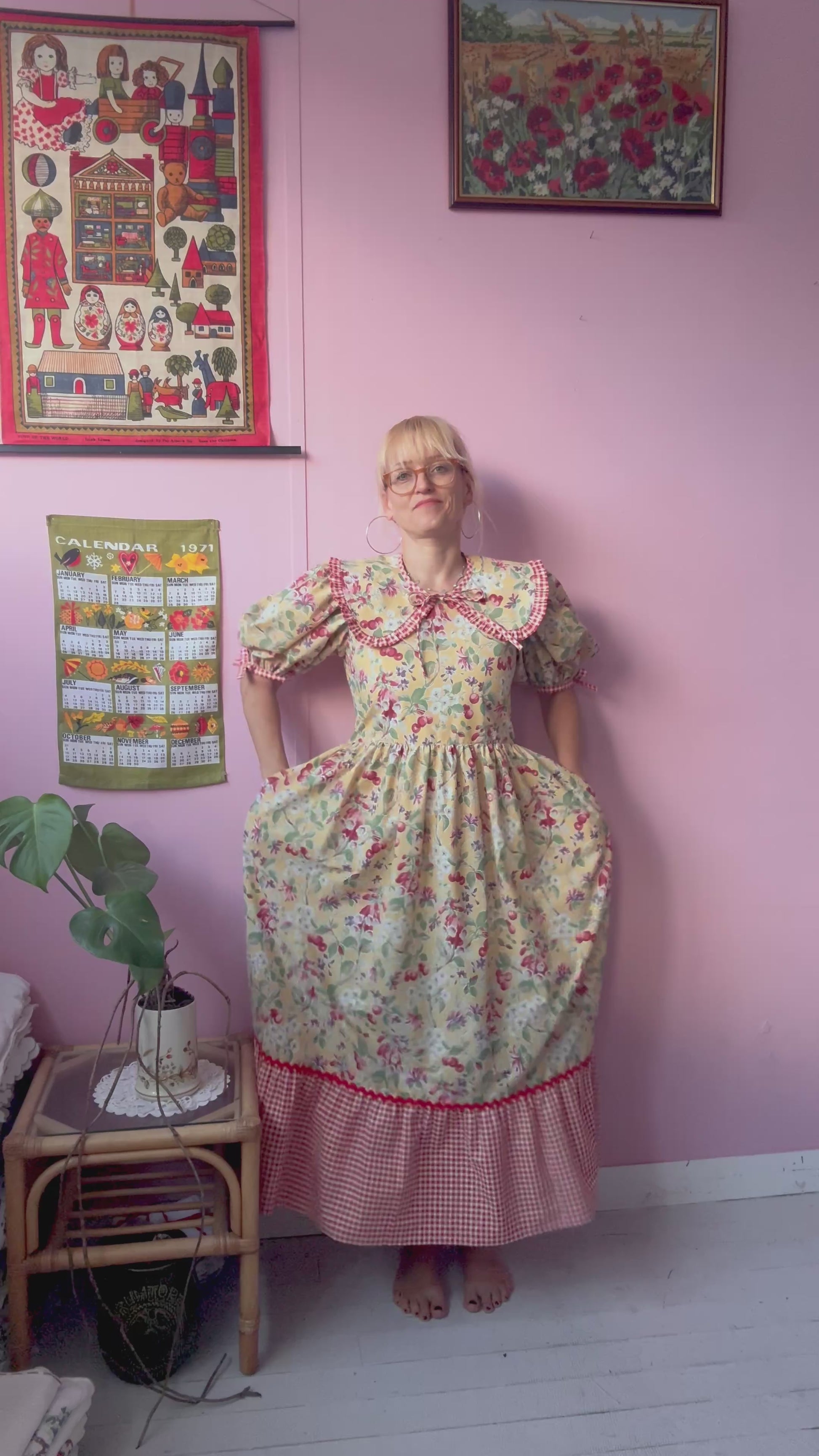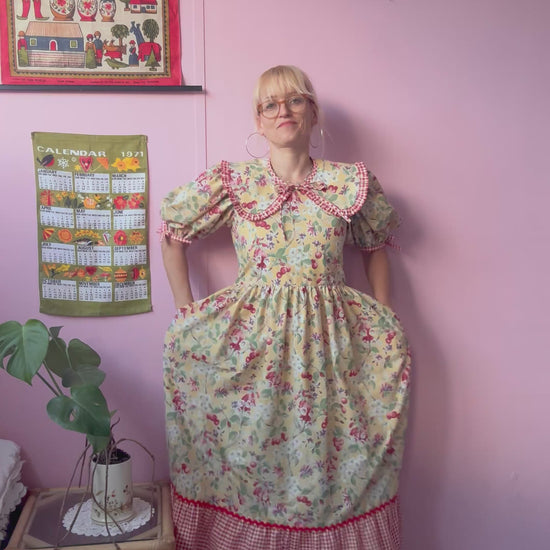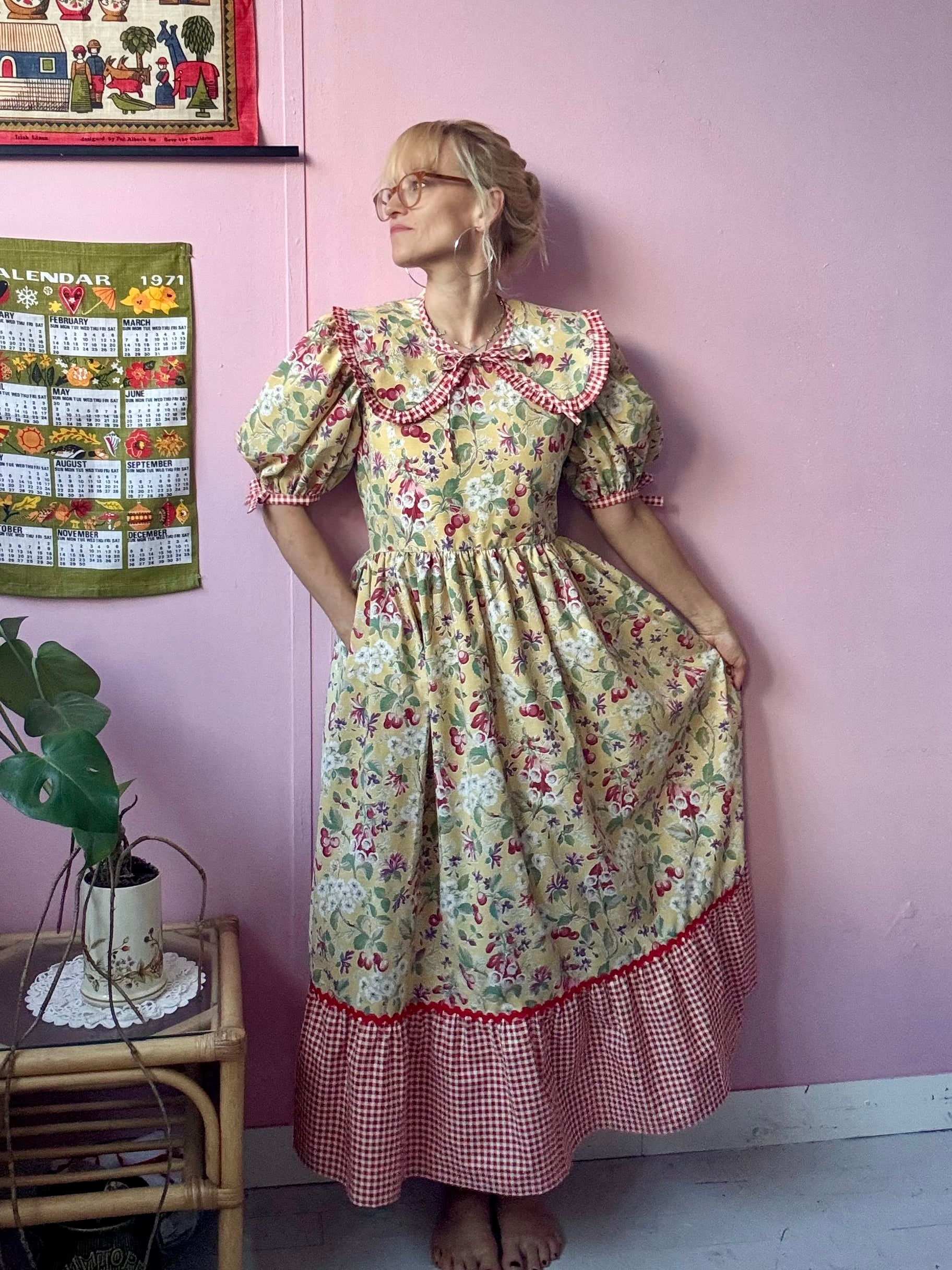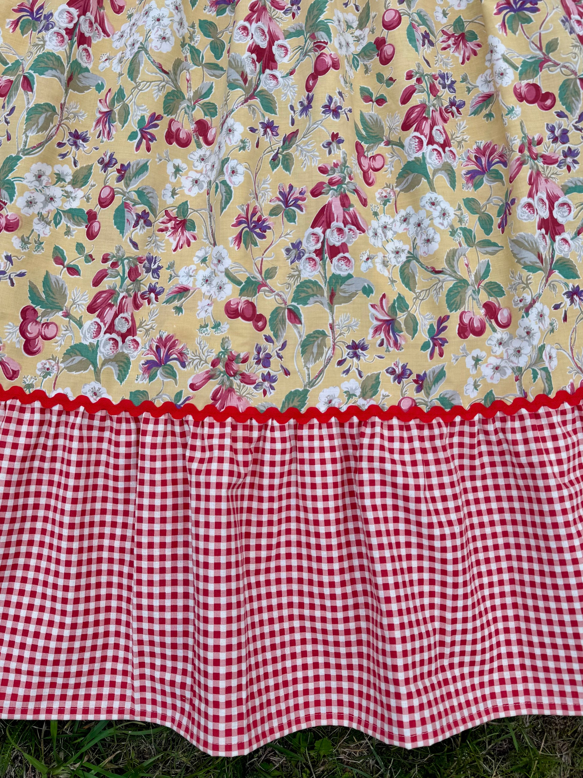 Yellow fruity dress made from vintage curtains with an amazing print-cherry and cherry blossoms and gingham curtains