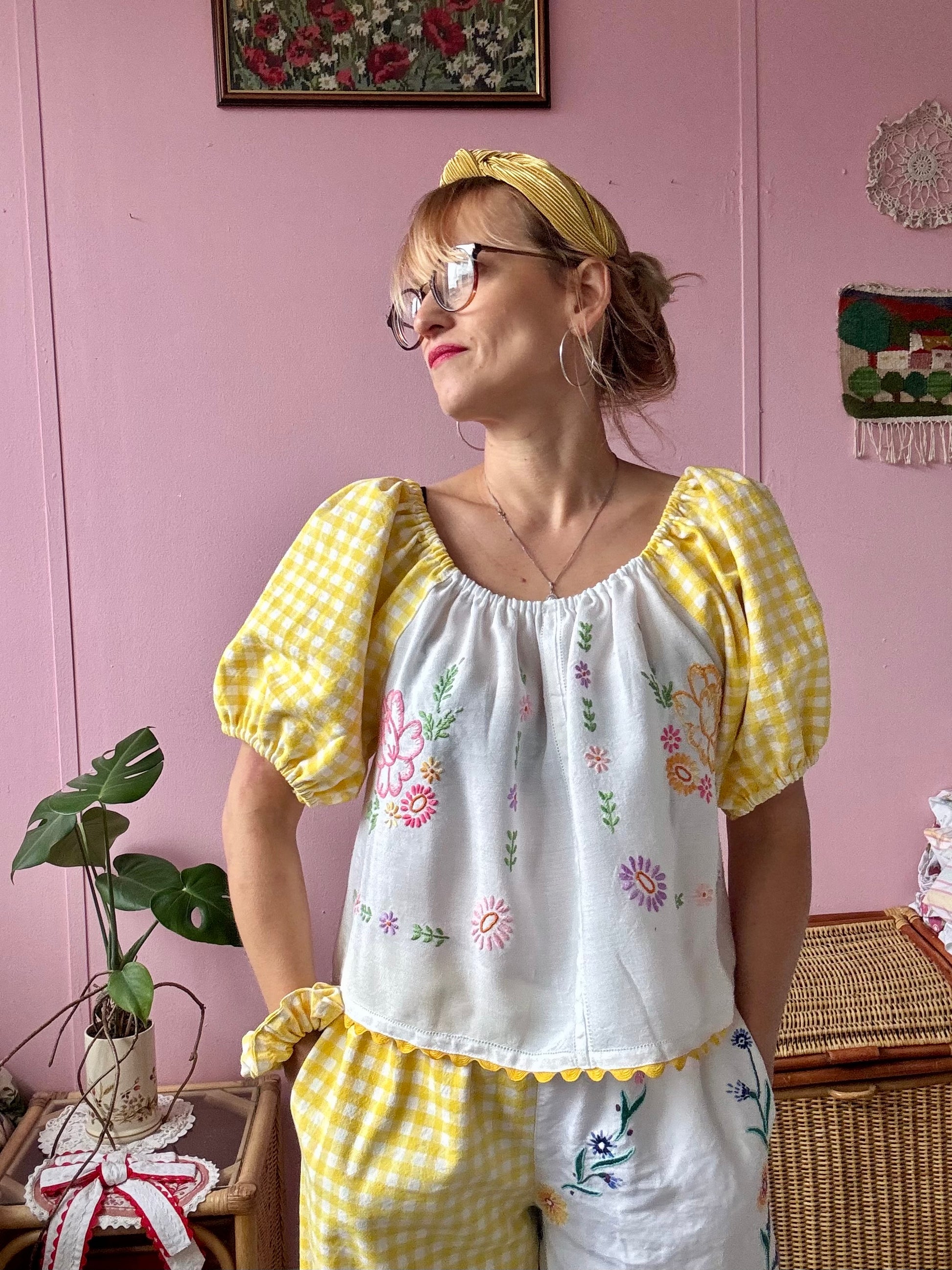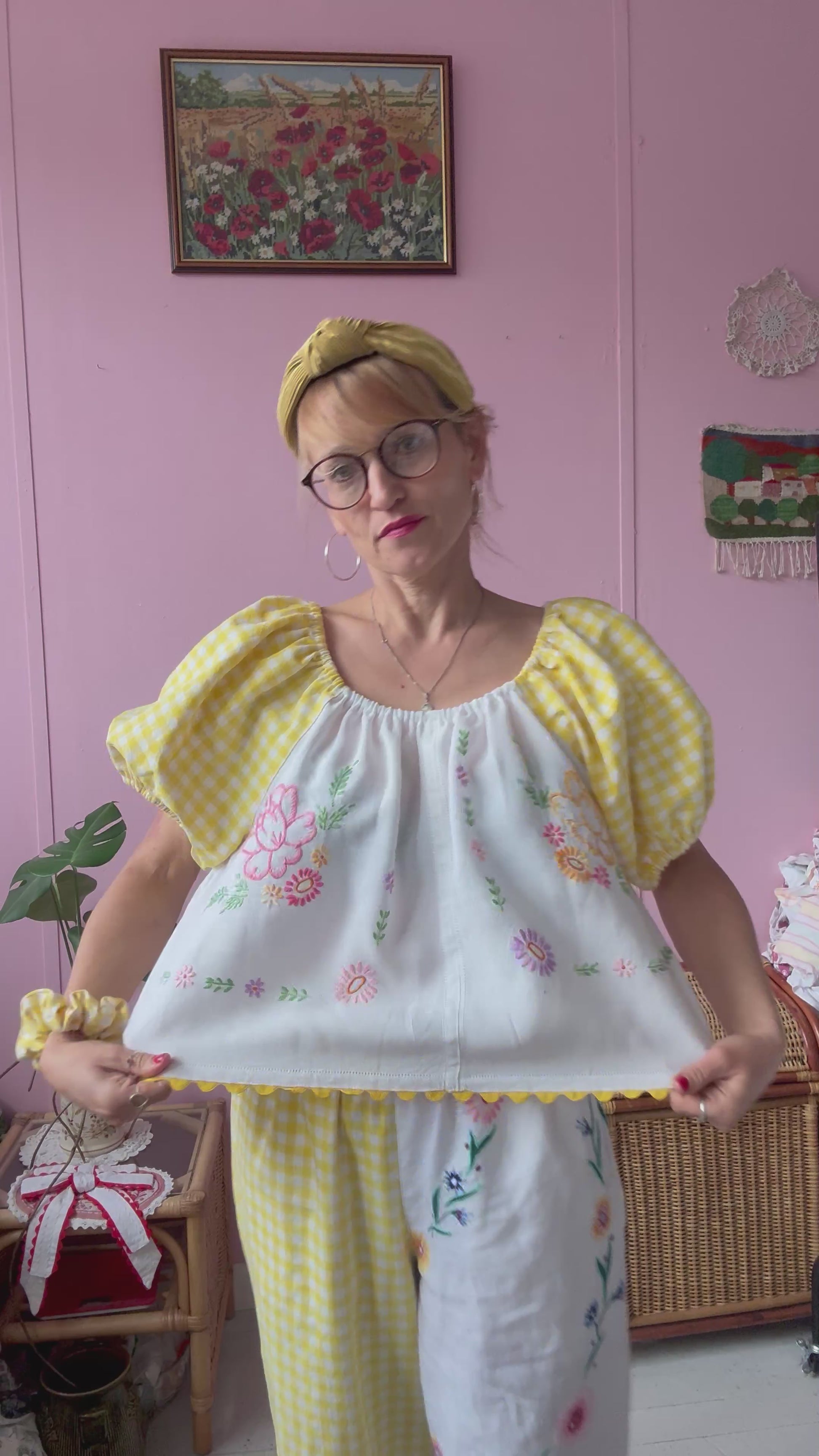 Floral and gingham blouse made from vintage tablecloth with floral hand embroidery and yellow gingham curtains