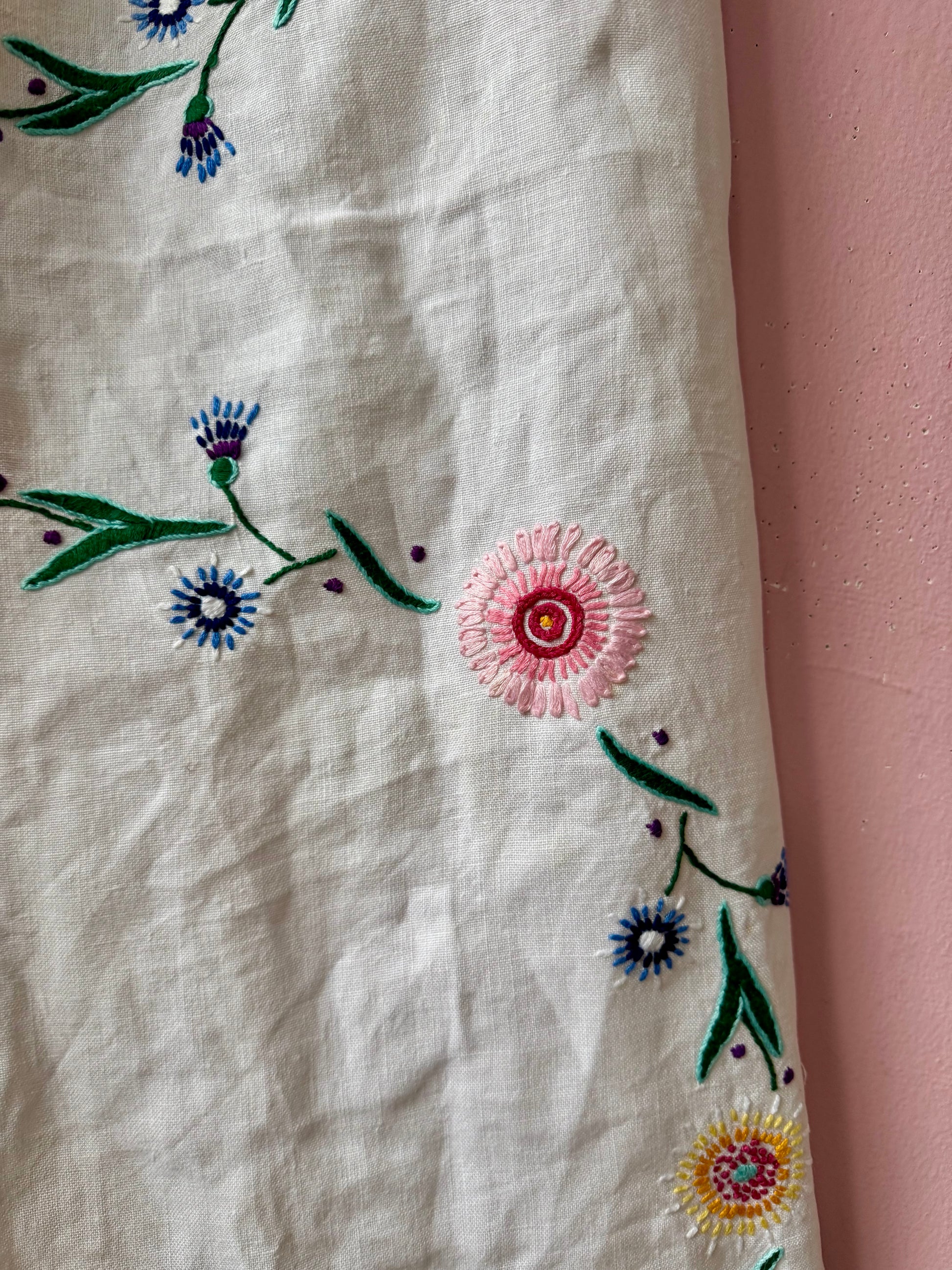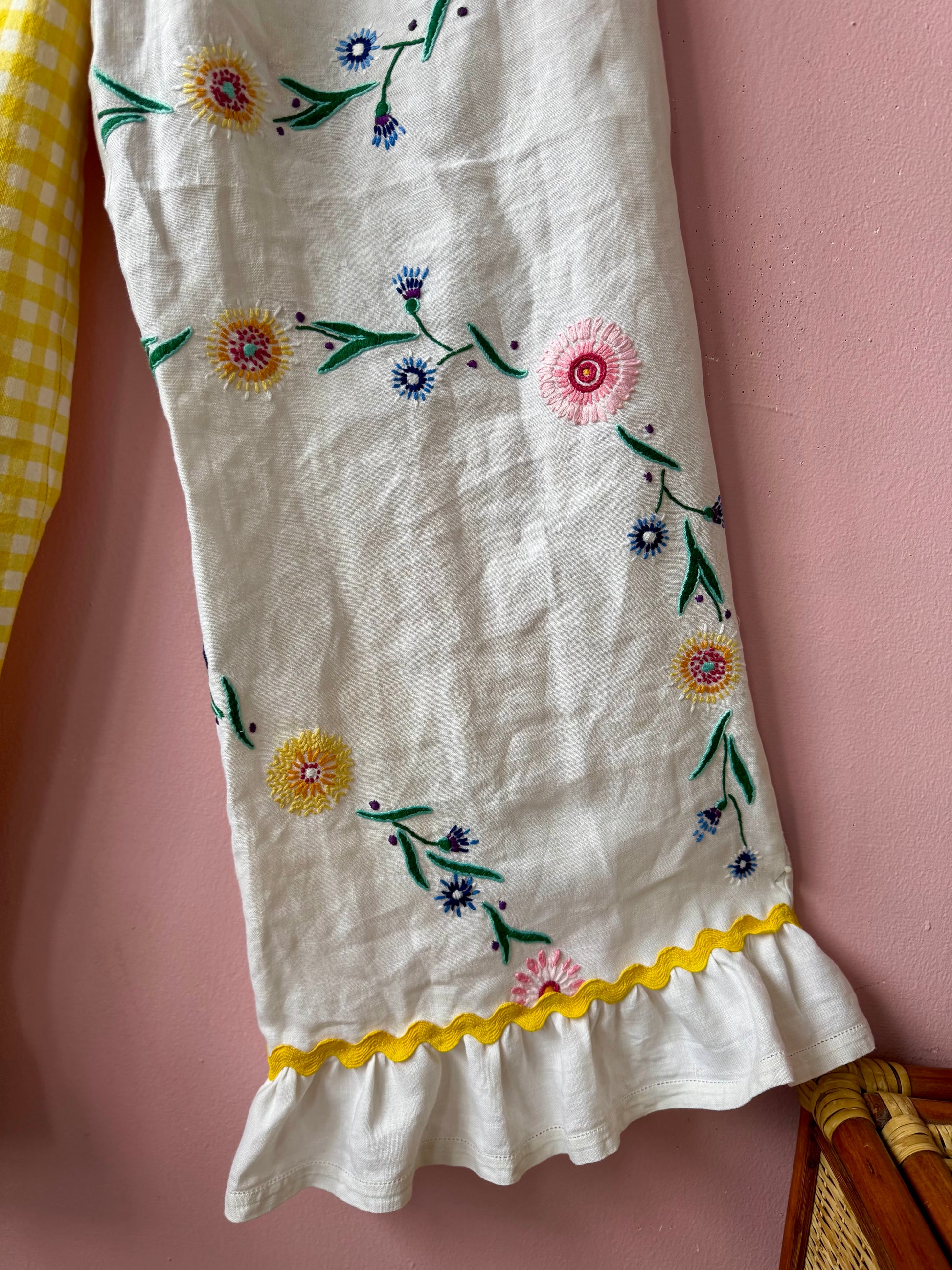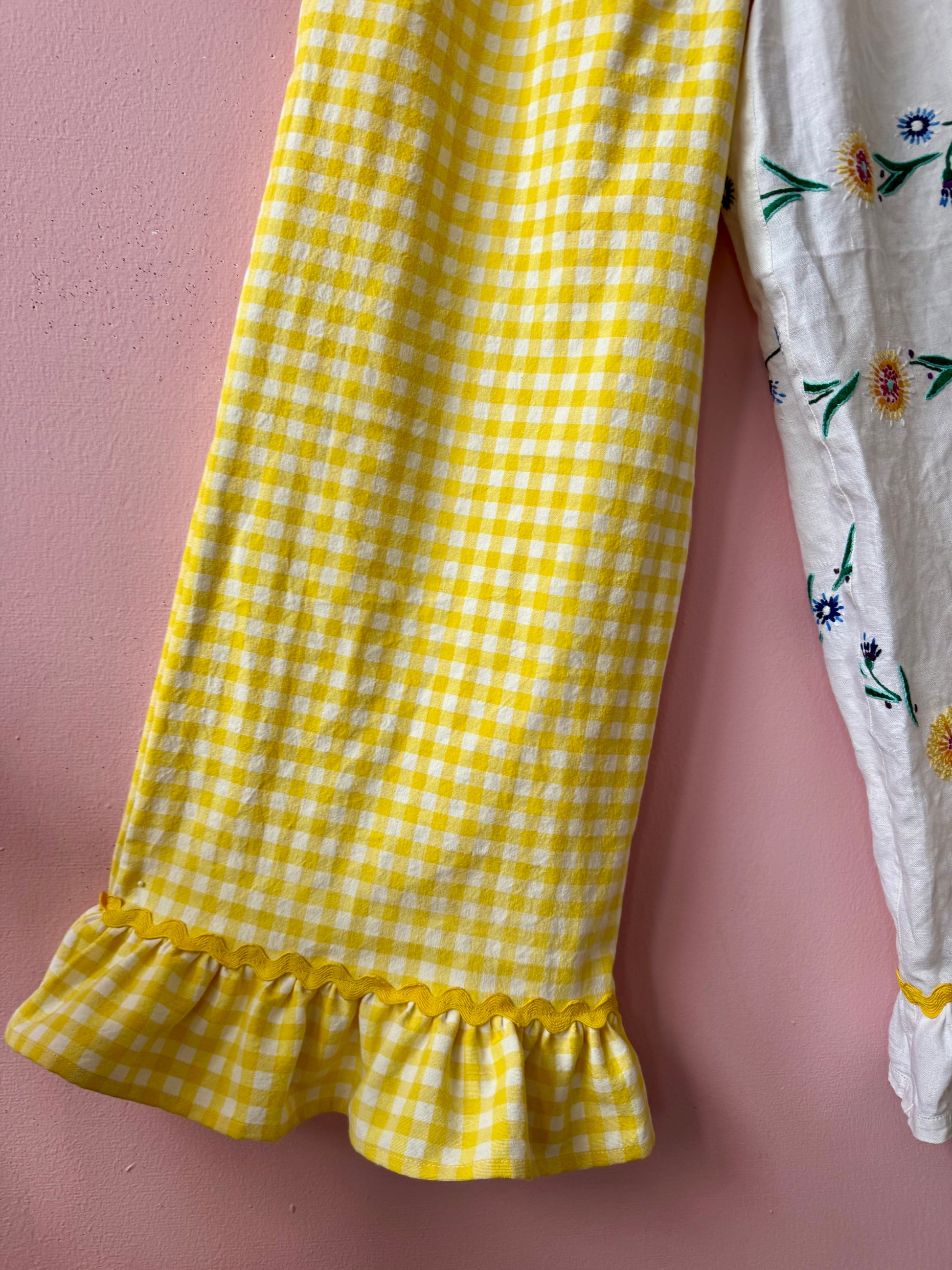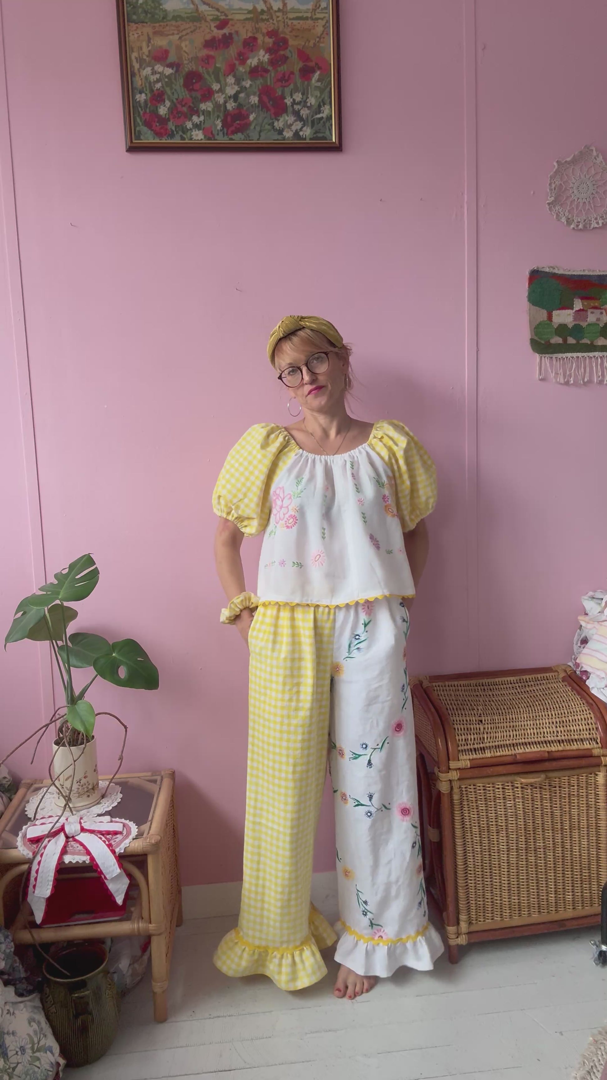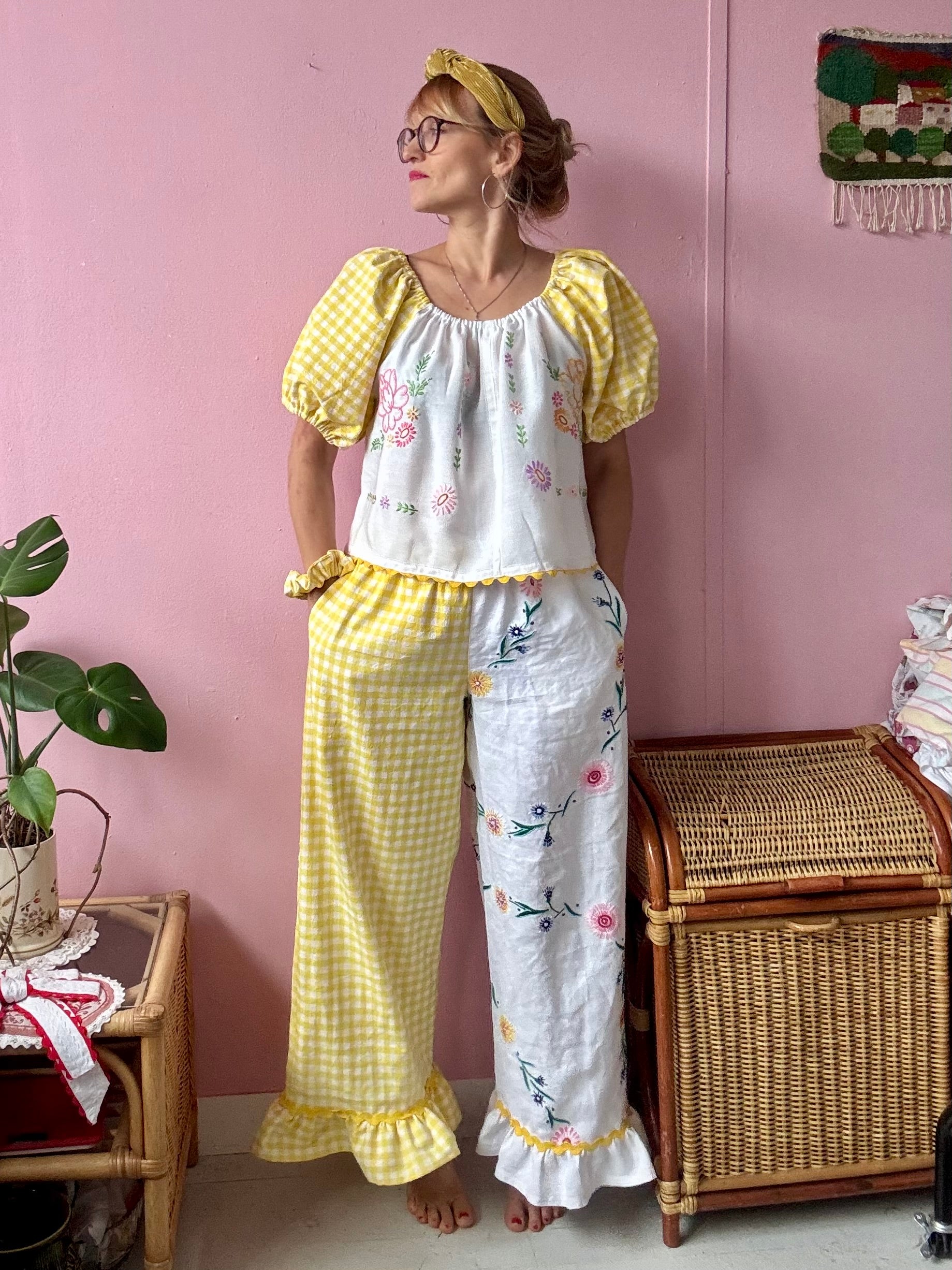wide leg trousers made from vintage tablecloth and vintage curtain with floral hand embroidery and yellow gingham