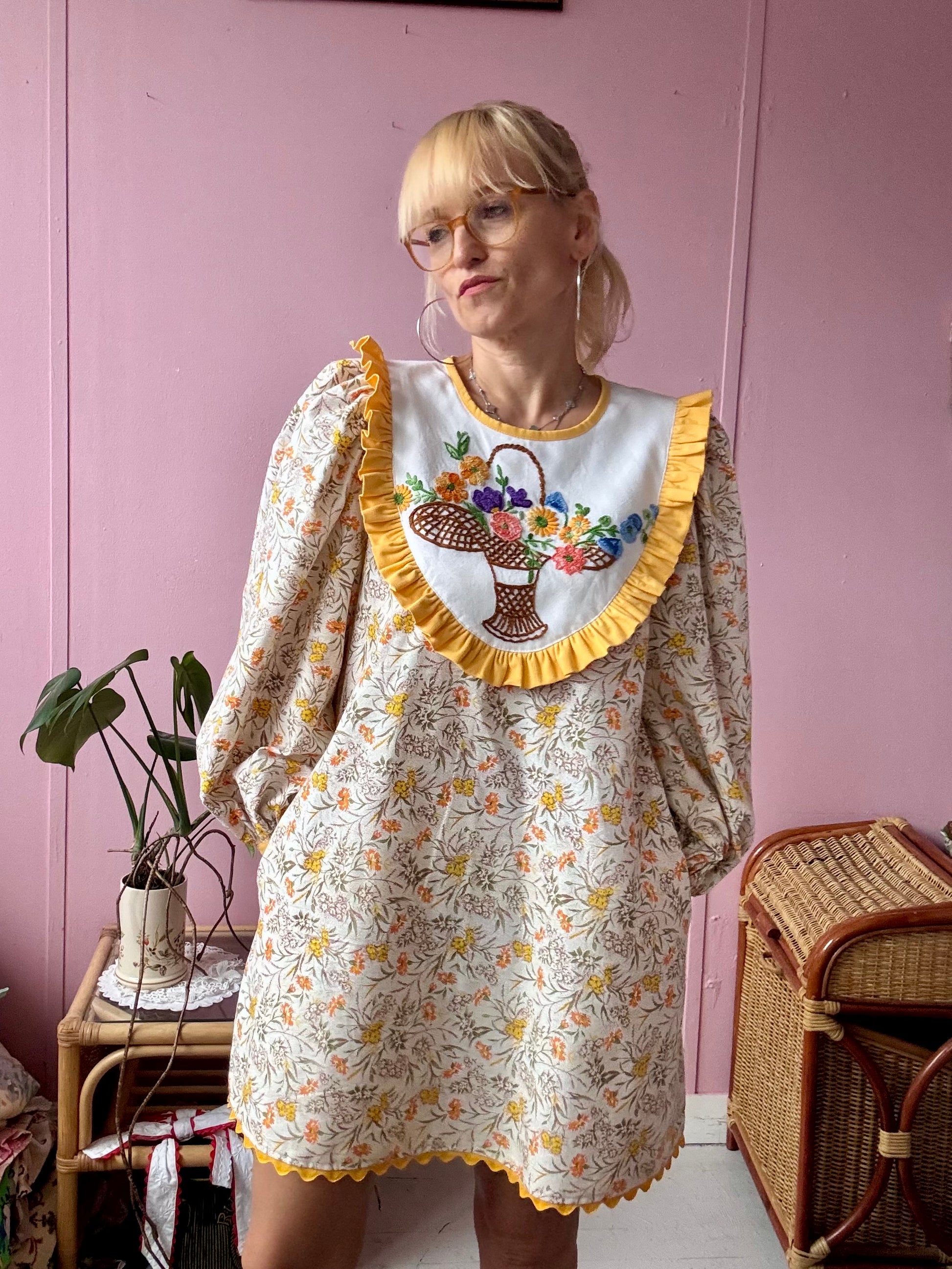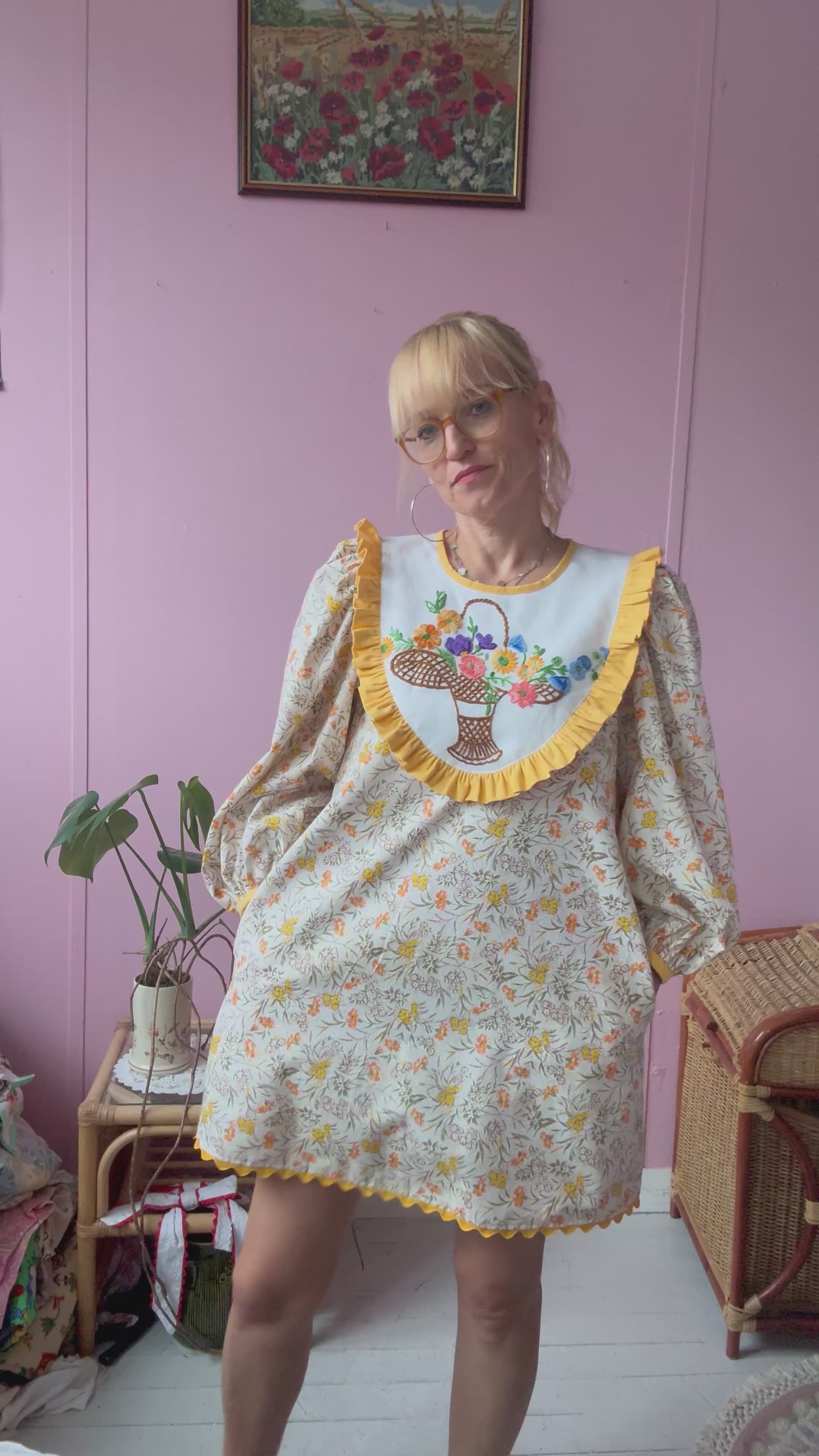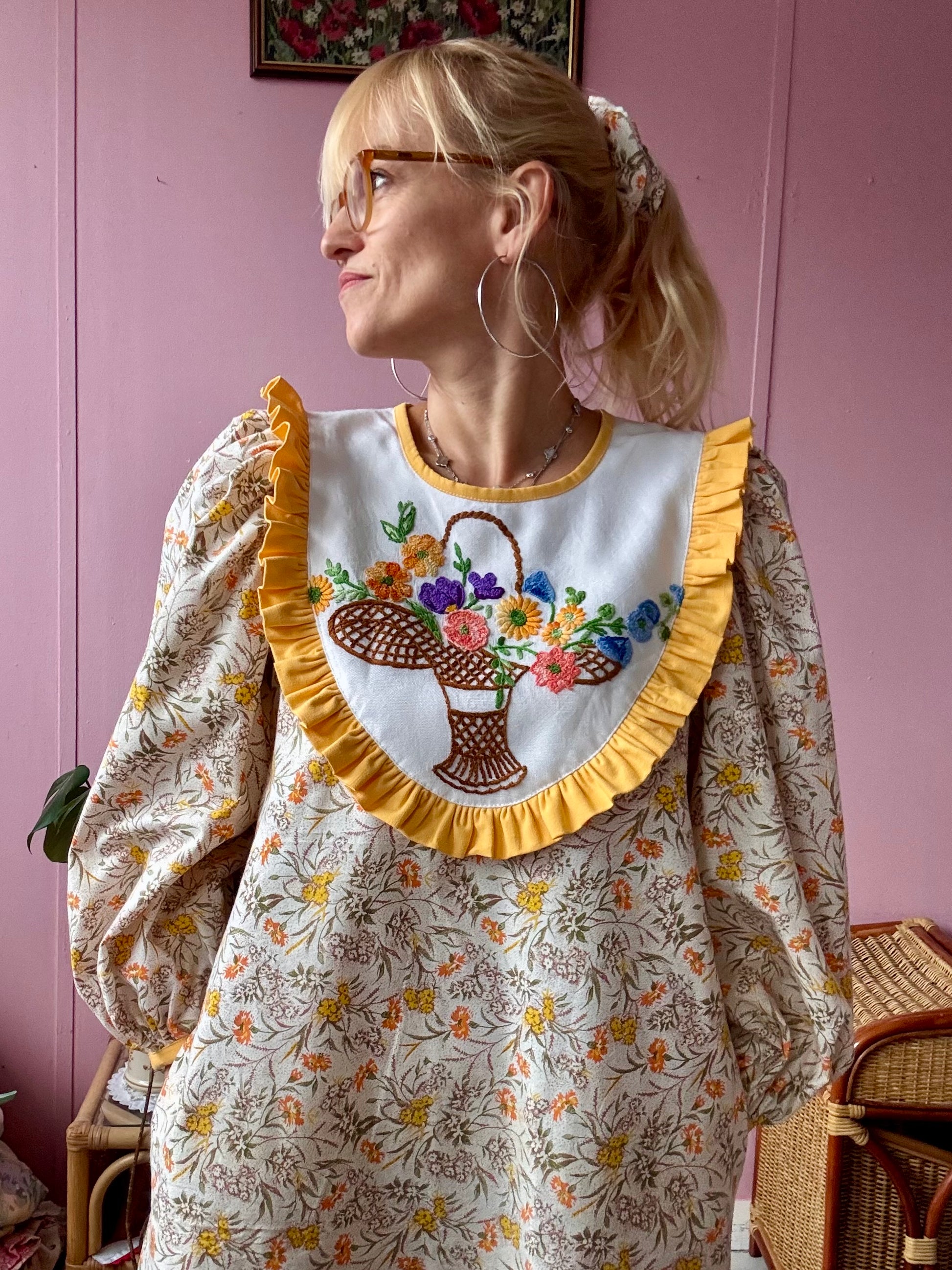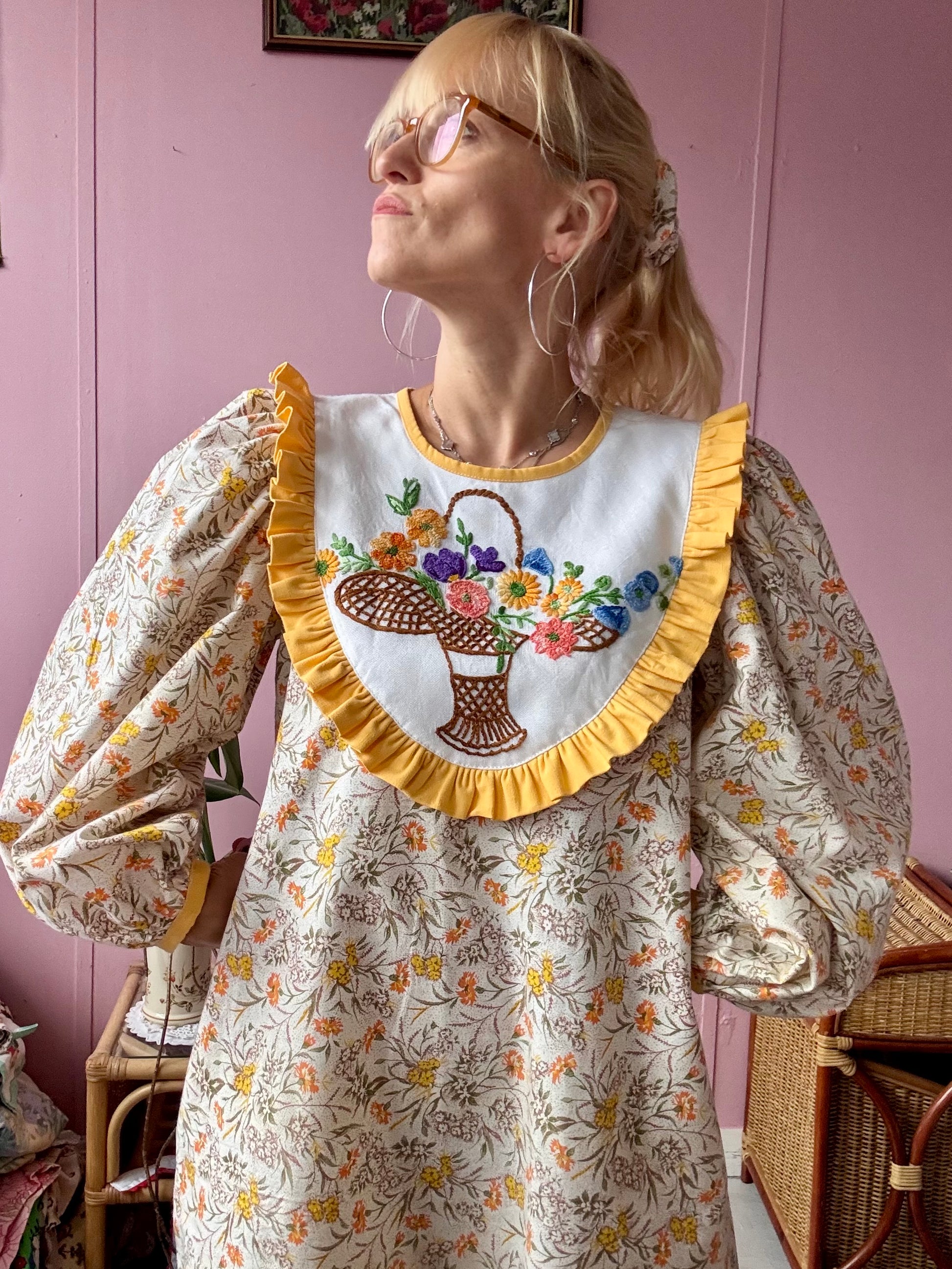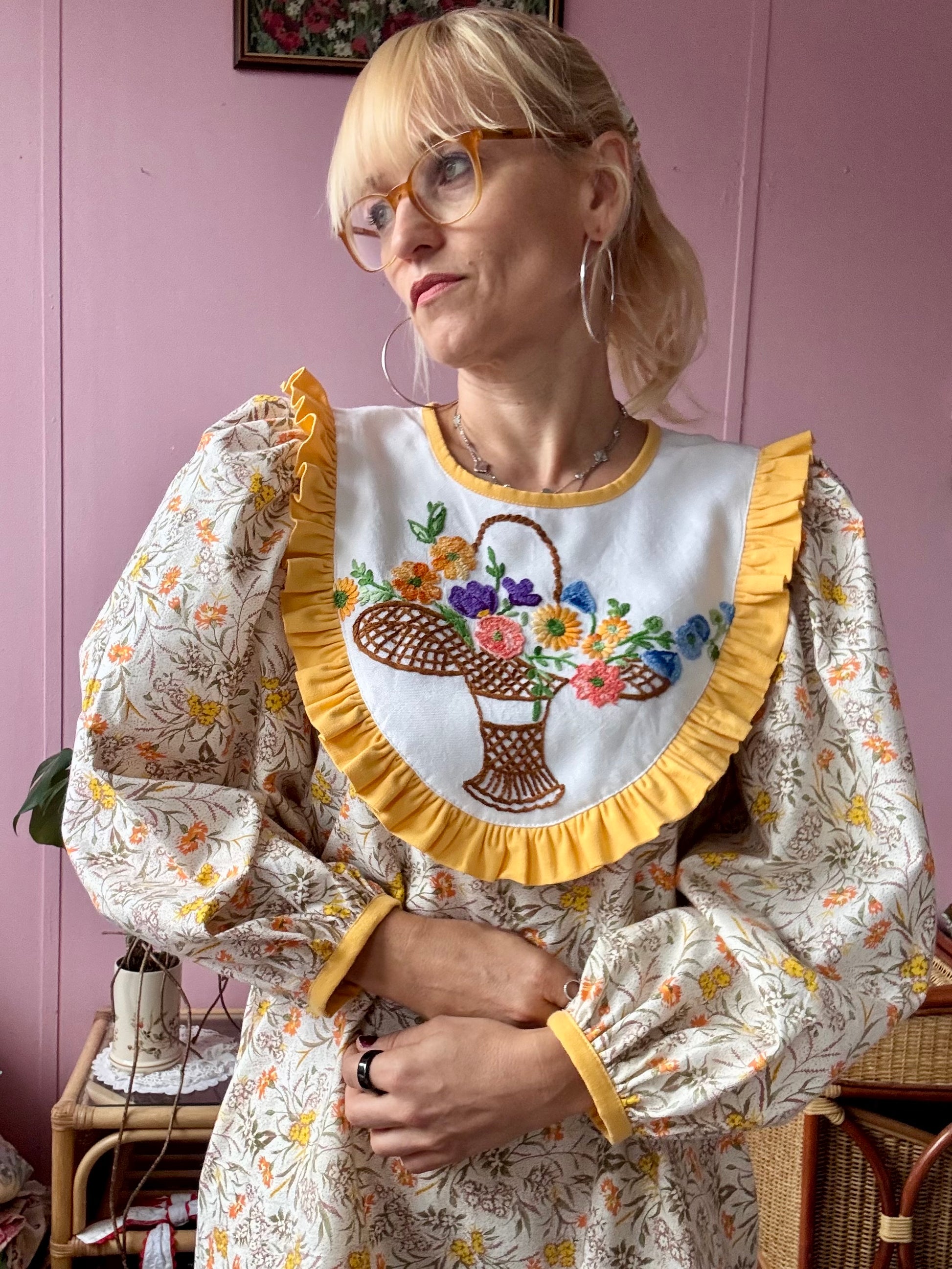 front panel decoration made from vintage floral basket hand embroidery table piece decorated with yellow frill and yellow neckline binding