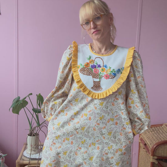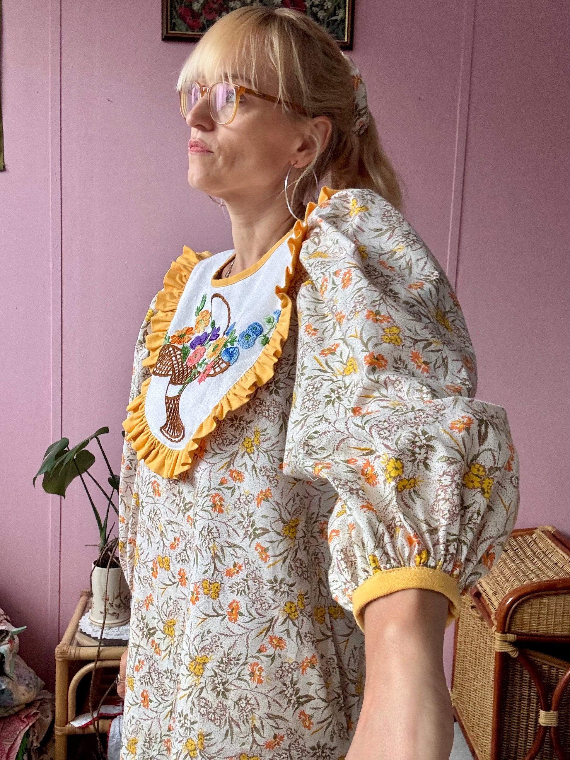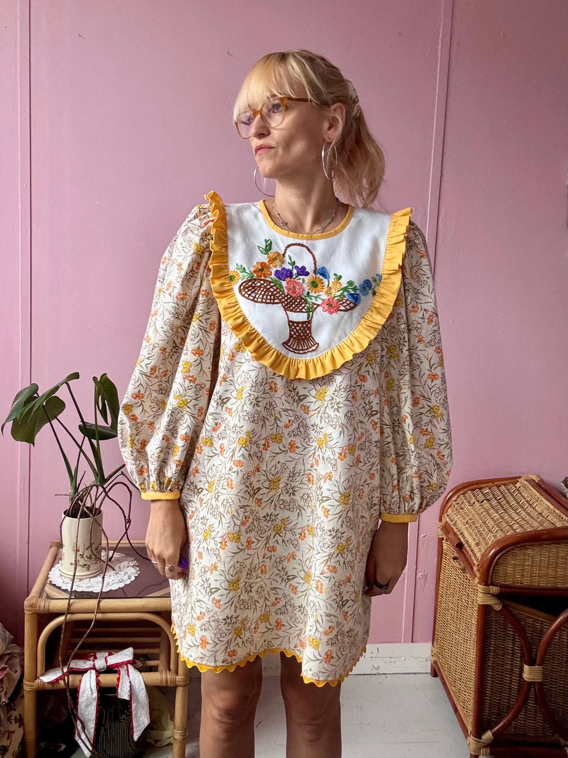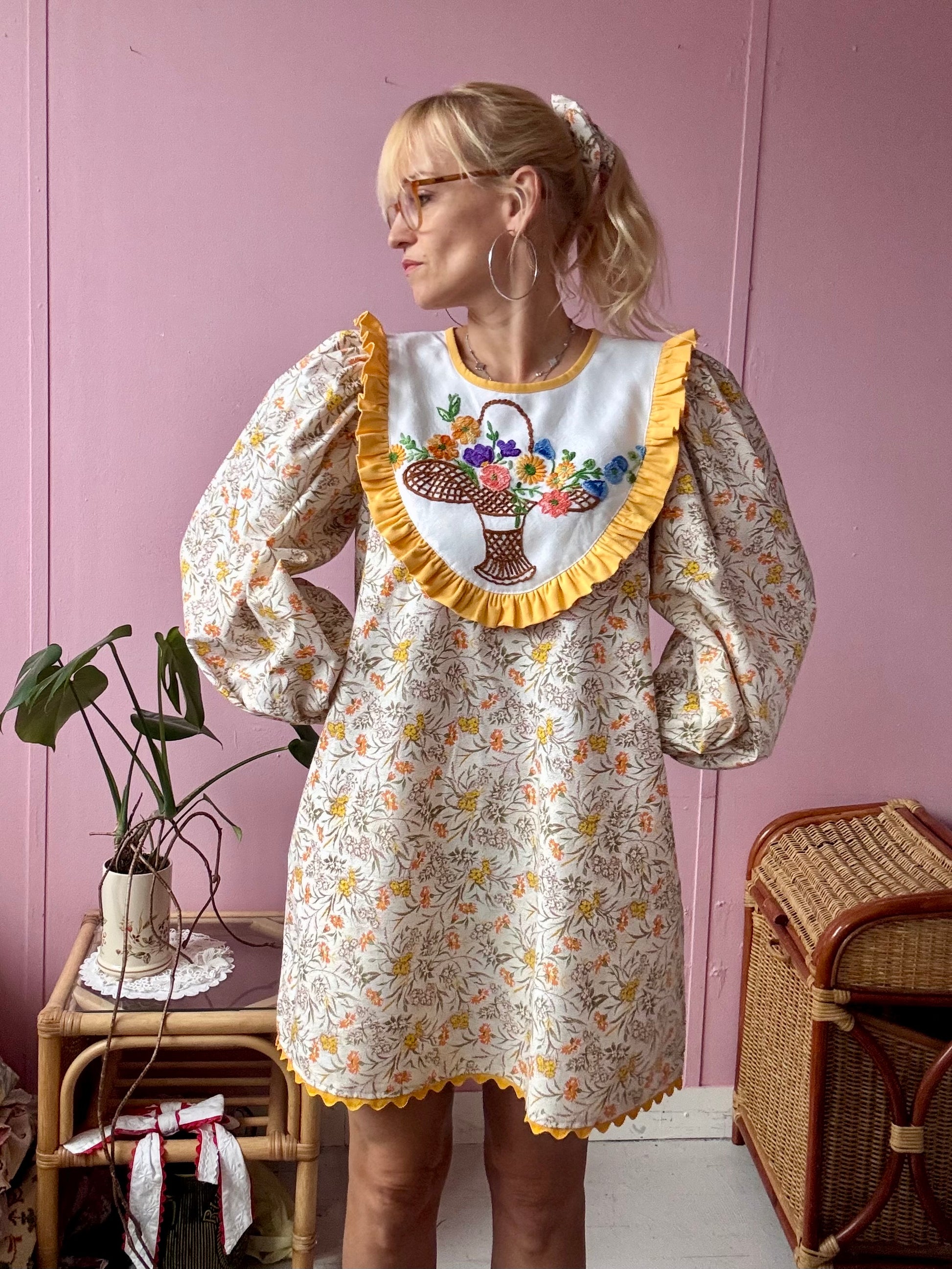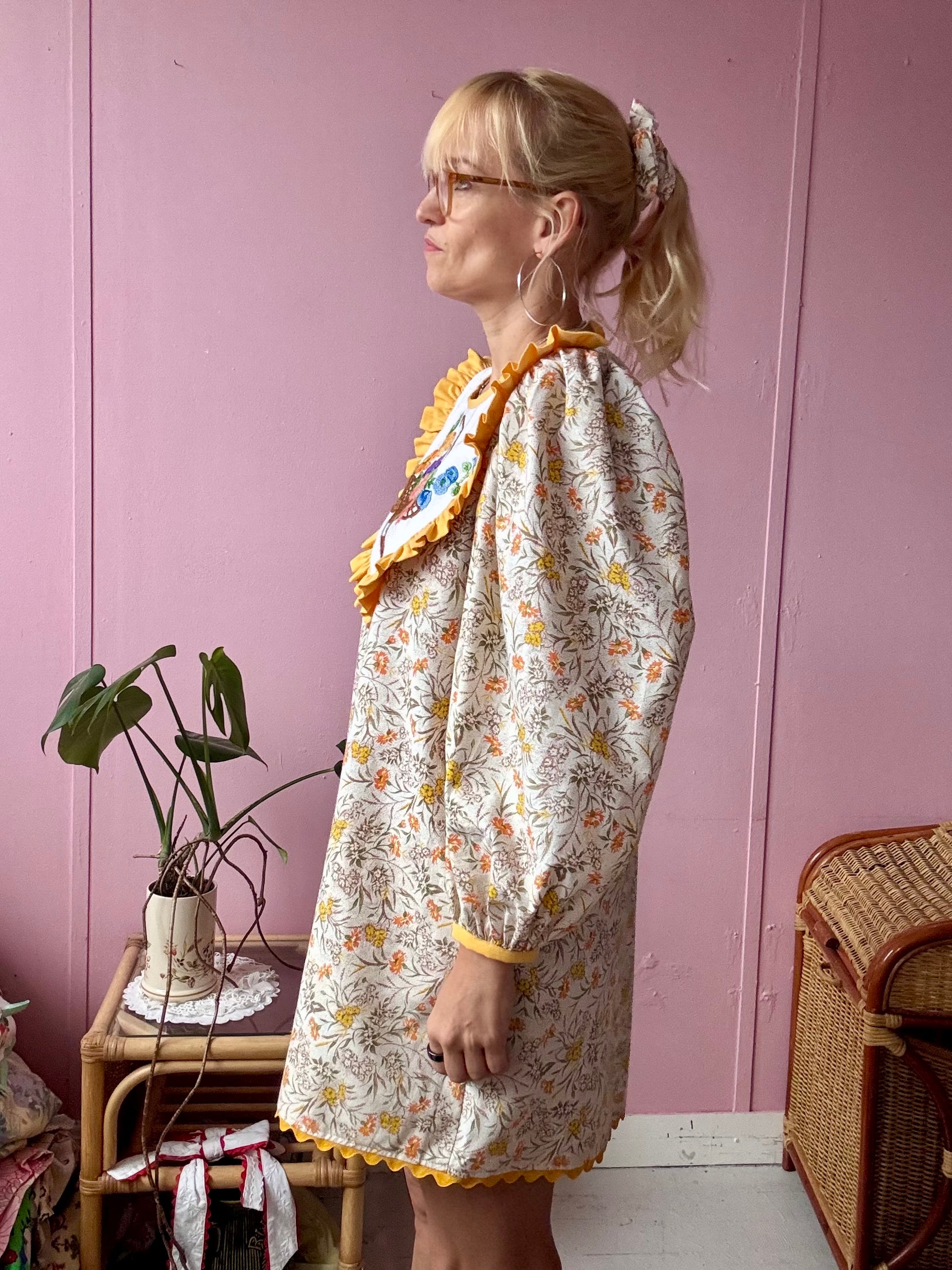 Yellow/orange floral mini dress made from vintage cotton fabric